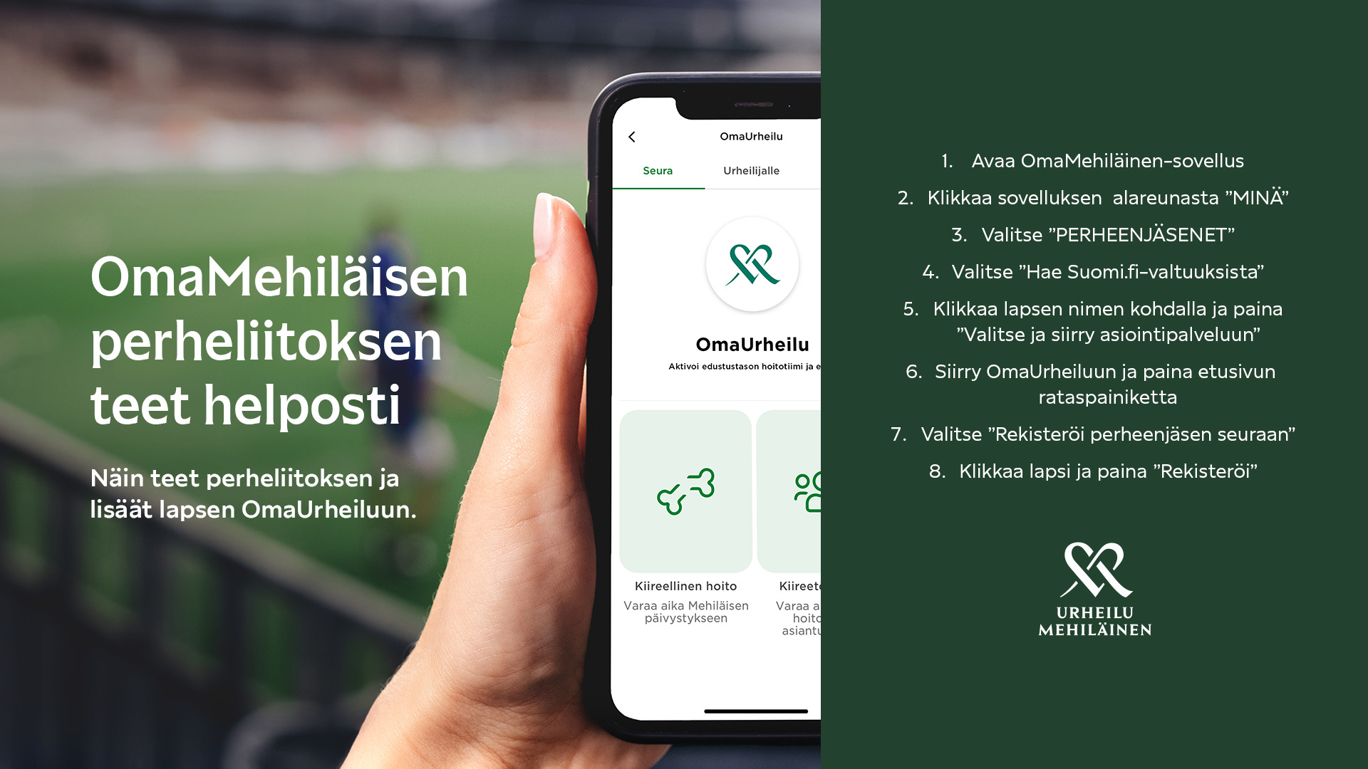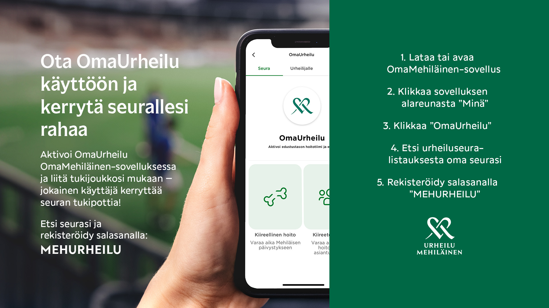 OmaUrheilu on Urheilu Mehiläisen kumppanuusseurojen jäsenille tarkoitettu palvelu, joka tekee terveyteen ja tapaturmiin liittyvästä asioinnista helppoa ja nopeaa. Palvelusta löydät seurallesi nimetyn hoitotiimin, varaat vastaanottoajat ja saat tärkeät yhteystiedot nopeasti loukkaantumistilanteessa.