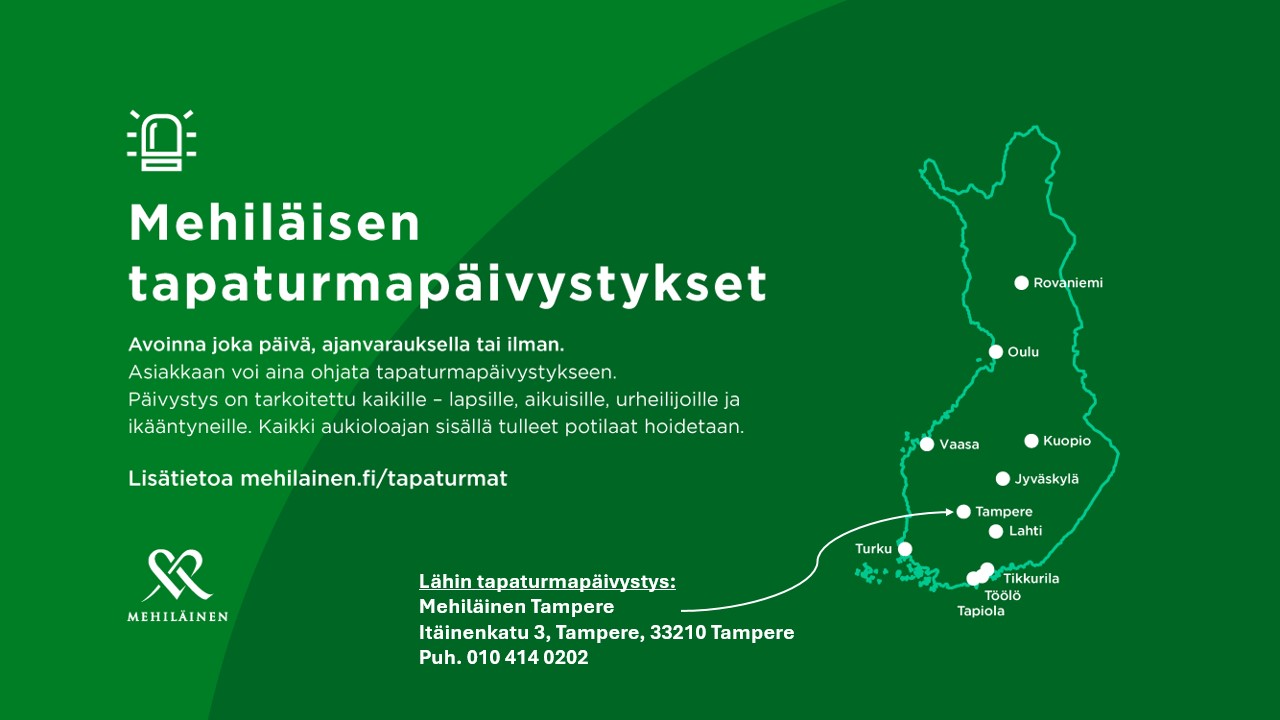 Tapaturman tai äkillisen vamman sattuessa Mehiläisen tapaturmapäivystys palvelee vuoden jokaisena päivänä. Saat nopeasti hoito-ohjeet ja tarvittaessa ajanvarauksen päivystykseen soittamalla numeroon 010 414 0202 – tai voit tulla suoraan ilman ajanvarausta.